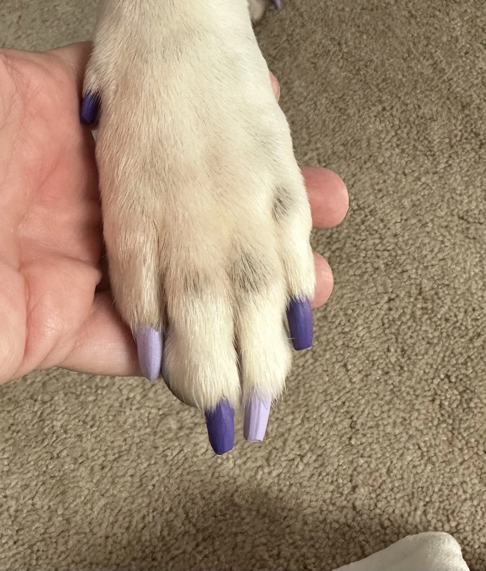 Nail painting with pet-safe nail polish upon request.